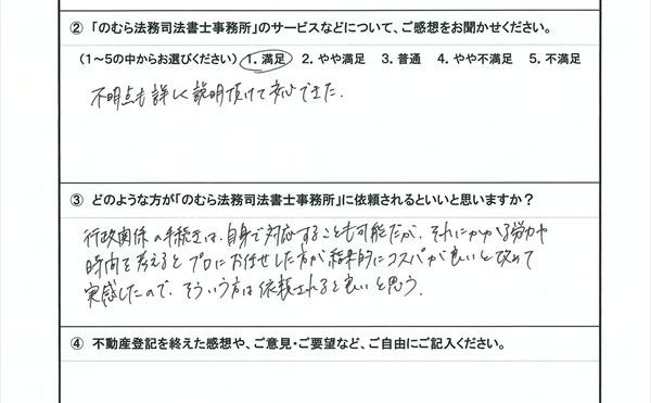 ①数ある中から当事務所を選ばれた理由はありますか? 何社か比較検討した中で安価で、HPの「お客様の声」から信頼できそうと思ったから。また土曜日に営業している点も良かった。 ②「のむら法務司法書士事務所」のサービスなどにつ […]