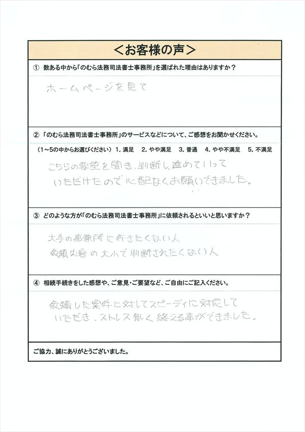 ・相続手続も無事円満に終わりそうです。とても感謝しております。